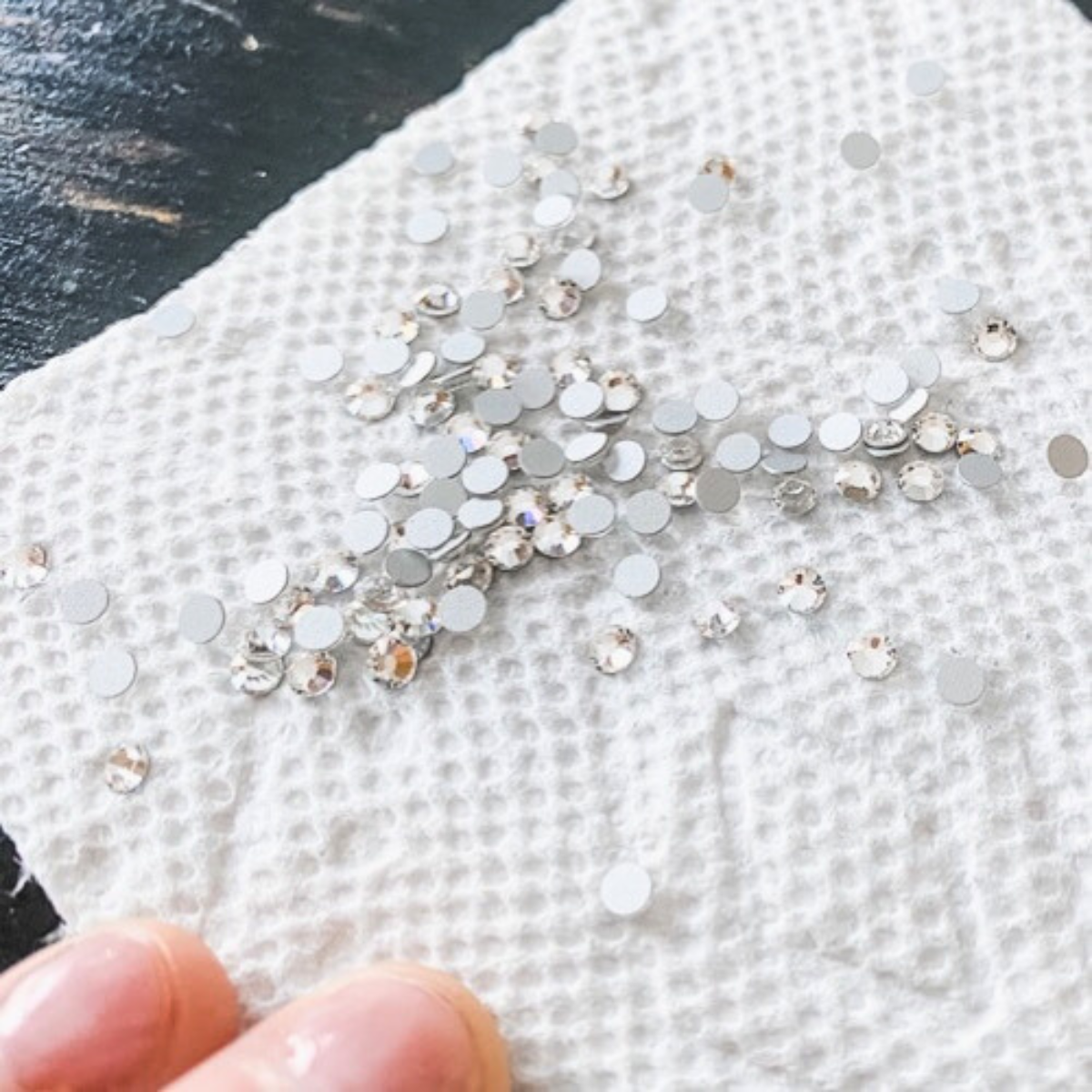 Step 1: Prep your crystalsPour a small amount of rhinestones onto a ridged paper towel and gently shake to help flip the stones face-up (foil side down). Prefer less mess? Use the Crystalline Magical Tray—it does the same job and keeps everything contained. |
