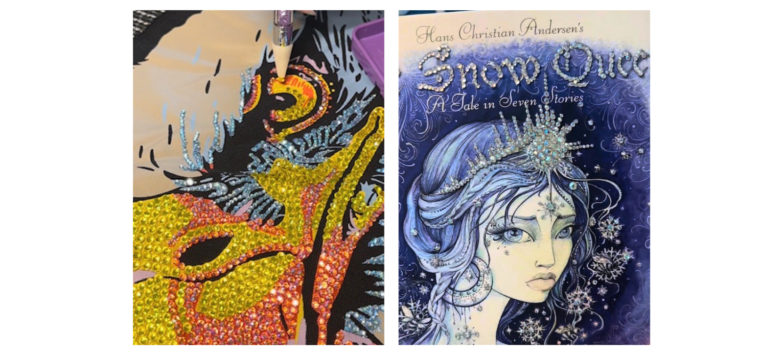 The comic art piece is bold and playful—notice how she uses size variation in the rhinestones to create shading and dimension. The Snow Queen is hauntingly beautiful—those icy blue rhinestones feel like they belong on a fairy tale cover. These pieces show she's not afraid to experiment with scale, subject matter, and creative storytelling through rhinestones.