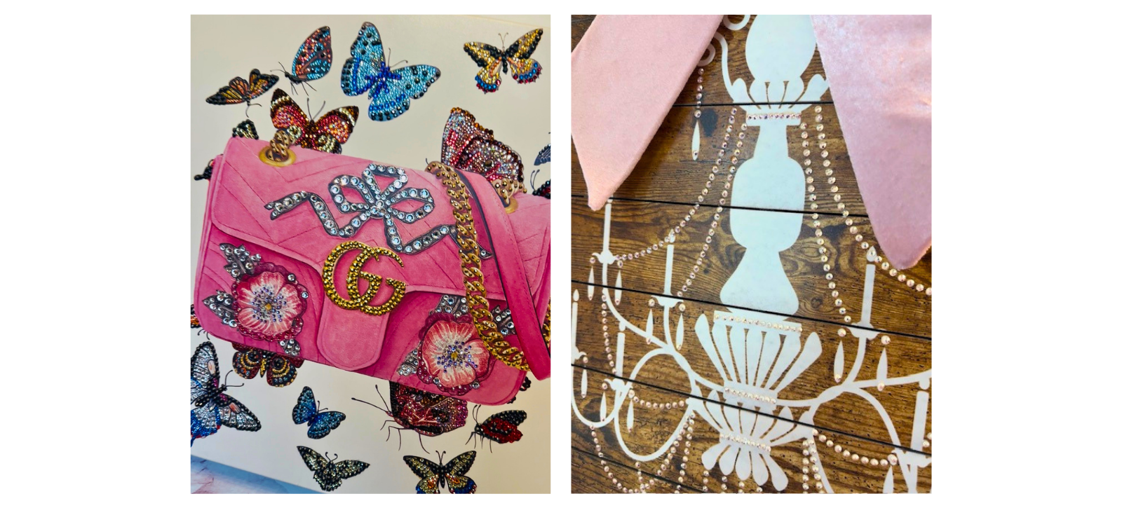 The pink bag is luxury rhinestoning at its finest—intricate floral designs, designer-inspired details, and those stunning butterflies that seem to dance across the fabric. The chandelier design shows her ability to work on unconventional surfaces and create dimensional, gallery-worthy art.