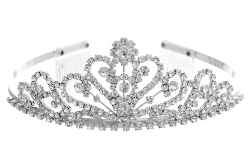 Crystal heart center tiara - Crystal. Measures approximately 5" wide x 2" tall. This tiara is secured by two haircombs, one on each end of the headband.