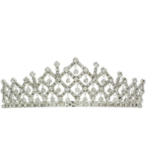 Crystal dangling round pendants tiara - Crystal. Measures approximately 6" wide x 1.5" tall. This tiara is secured by two haircombs, one on each end of the headband.