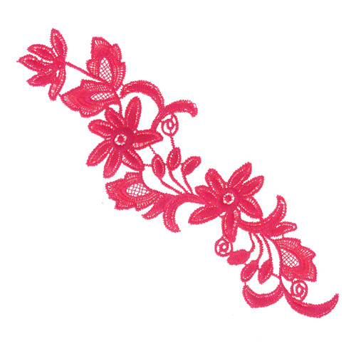 The Pink Viola A Applique offered a soft, feminine touch to custom costume creations and formalwear accents. Measuring 9.5 inches tall by 3 inches wide, this graceful curved applique featured delicate pink embroidery—perfect for romantic or whimsical designs. Whether placed symmetrically on a bodice or as a sleeve detail, it was an ideal foundation for adding shimmer with rhinestones in coordinating tones.