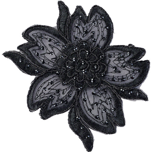 This delicate and bold black floral applique features a combination of sheer fabric, embroidery, and sequin details—perfect for enhancing dance costumes, headbands, or fashion pieces with a touch of elegance.