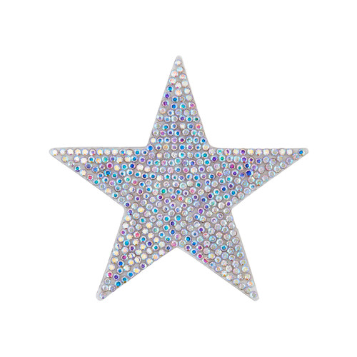 PriceLess Crystal Star Crystal AB Medium | 6.7cm x 7.2cm- 6 Pack. Each Star is self adhesive with a strong adhesive for application on most hard surfaces. For fabric, use the self adhesive application and then, using a barrier material, apply heat for extra strong adhesion.