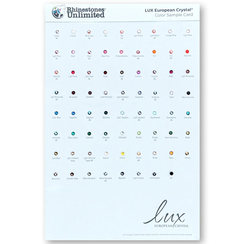 LUX European Crystal™ is a premium line of European crystals from Rhinestones Unlimited. Our Color Sample Card allows you to see the full spectrum of this crystal with your own eyes—70+ colors and effects! For your convenience, 20ss flat back crystals are mounted on a clear acetate sheet. You can then place your project materials under the sheet to see exactly how the colors interact in your design. A size chart is printed on the back side. Colors may not be available in every size.